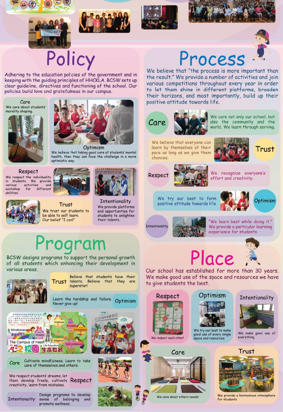 我們透過陶行知先生(1891-1946) 所提倡的「知、情、意、行」的教育理念,讓學生在完成六年的小學生活後,能把「六心」(感恩心、同理心、慈悲心、自信心、精進心、智慧心) 及覺察心紮根於生命當中學會「覺正」(對事情有正確的價值觀),「行儀」(良好的行為) 。「心如工畫師,能畫諸世間」,把正念思維從小植根學子心中,終其一生活出生命姿采,立己立人。